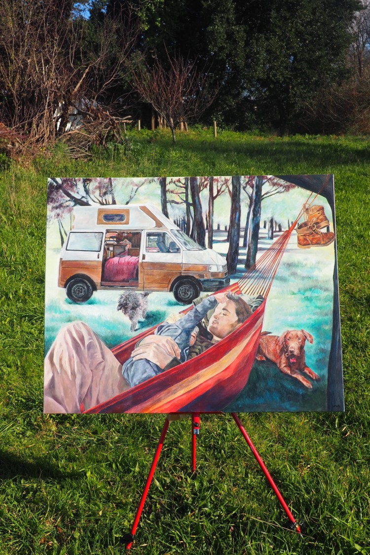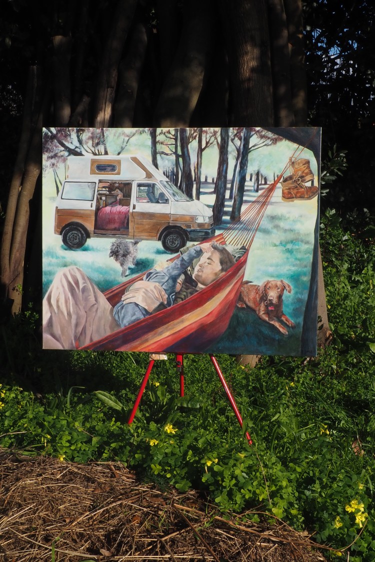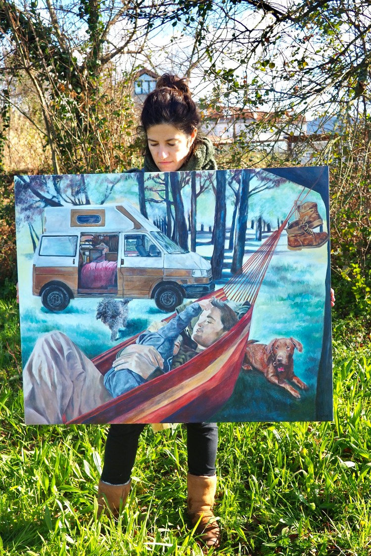 Óleo sobre lienzo, 50 x 65 cm. Realizado para cartel de cortometraje «Idiotas», estrenado el 26 de octubre de 2013. Con la voz en off de Tacho González para el perro guía Luna y las animaciones de Fass Castro. Hipotálamo Films.